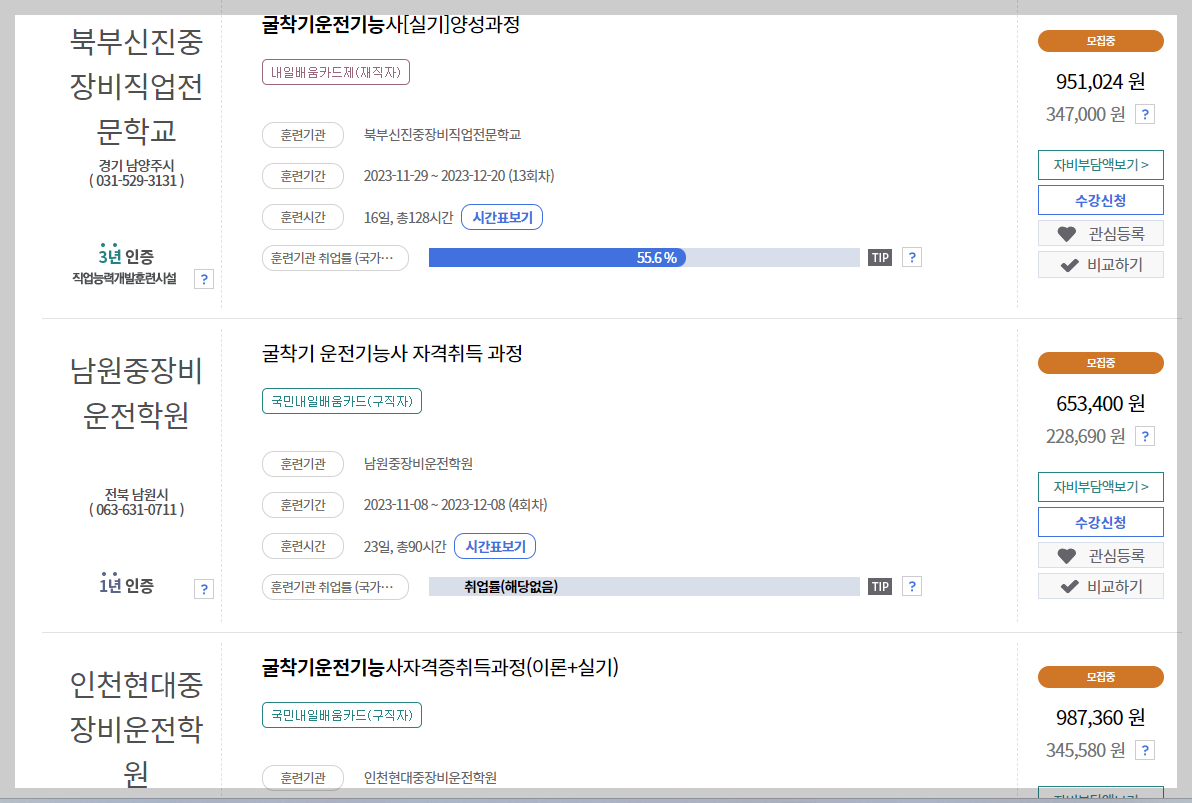 내일배움 홈페이지로 들어가 "굴착기운전기능사"로 검색하면