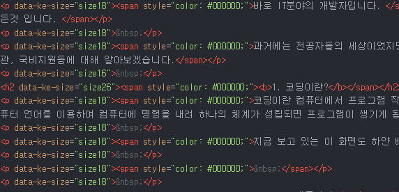 지금 보고 있는 이 화면도 하얀 배경에 검은색 글씨로 보이지만 사실 수많은 컴퓨터 코드로 이루어져 있습니다. 이렇게 컴퓨터의 언어로 명령어들을 통해 이런 화면과 기능이 구축이 되는 것입니다.