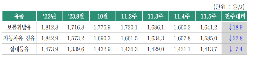 2023년 11월 5주 주유소 휘발유 판매가격은 전주대비 18.9원 하락한 리터당 1641원입니다.