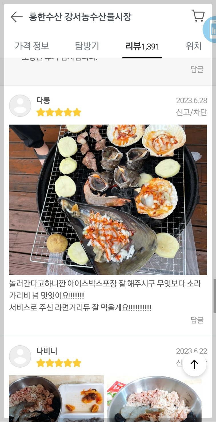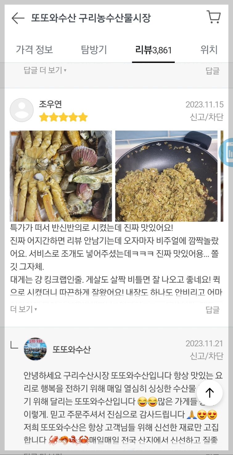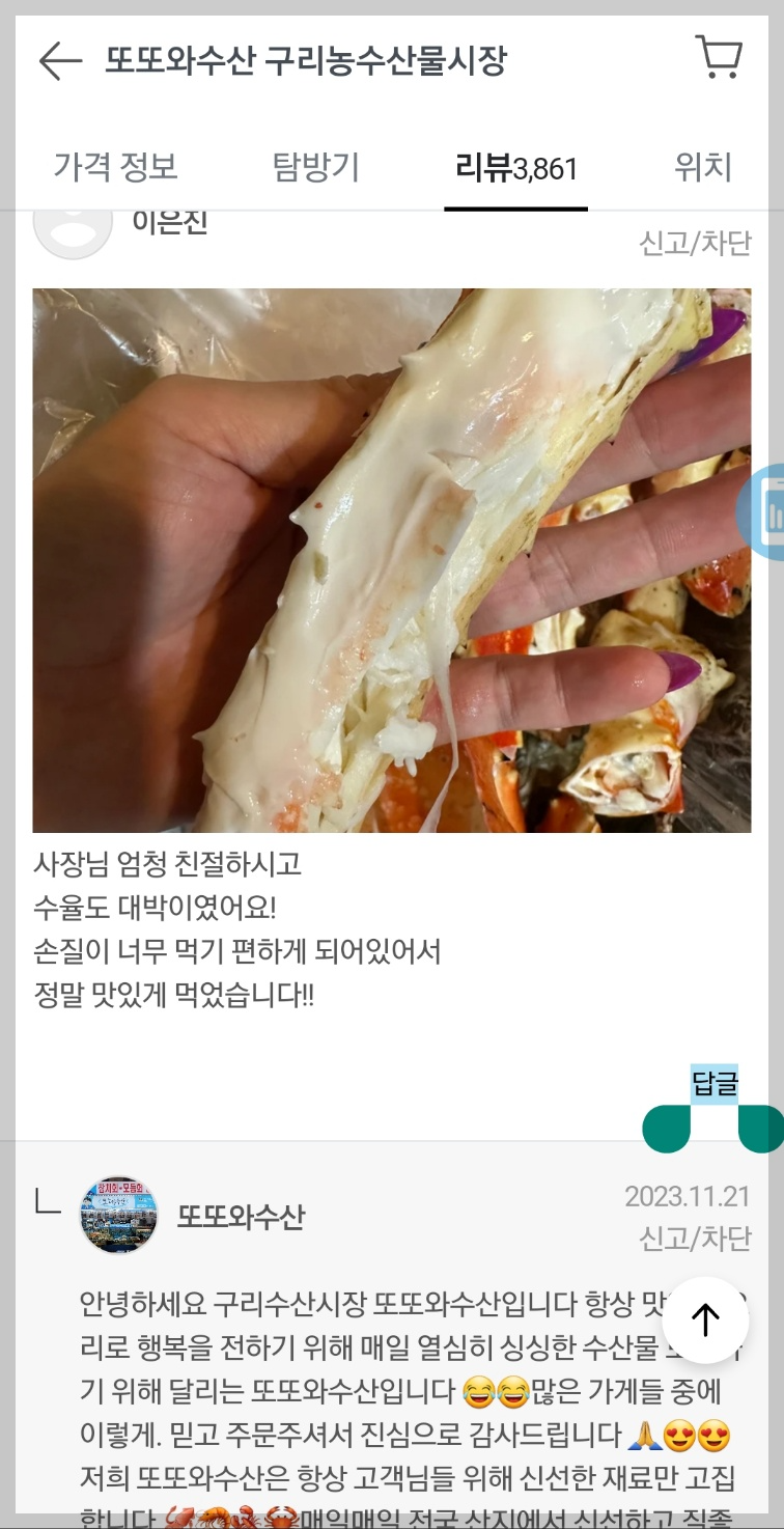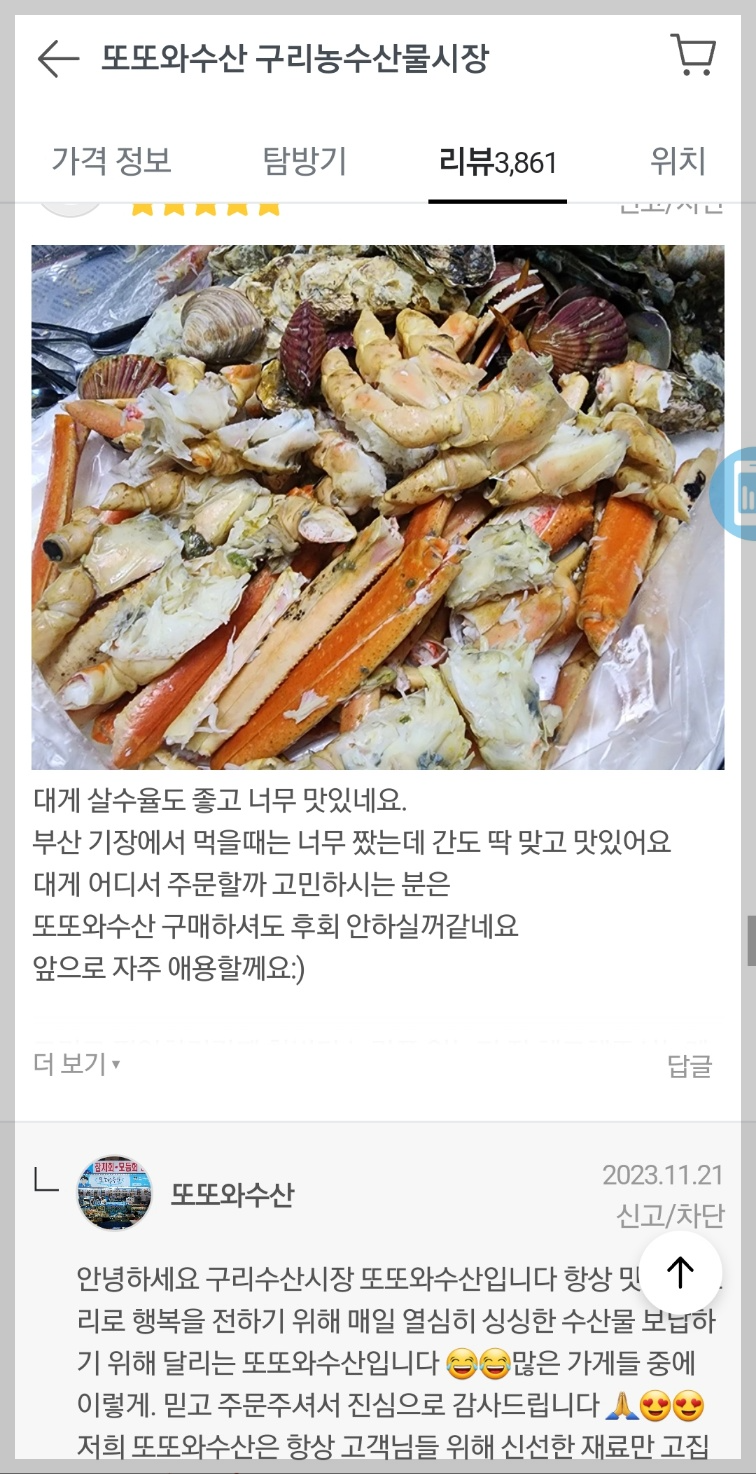 위의 킹크랩 시세 조회를 통해서 가격 싼 곳을 알아도 정말 맛있는 곳인지, 살이 꽉 차 있는지 확인하기는 어렵습니다. 특히 시장에 있는 가게는 후기를 확인하기가 더 어렵습니다. 해산물 가격이 비싼 만큼 좋은 가게를 찾은 것은 중요한 일입니다.
