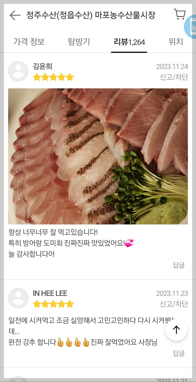 인어교주해적단 안에는 전국 수산시장 안 가게들의 리뷰와 오늘 시세를 바로 확인할 수 있어 싸고 좋은 가게를 찾는데 크게 도움을 받을 수 있습니다.